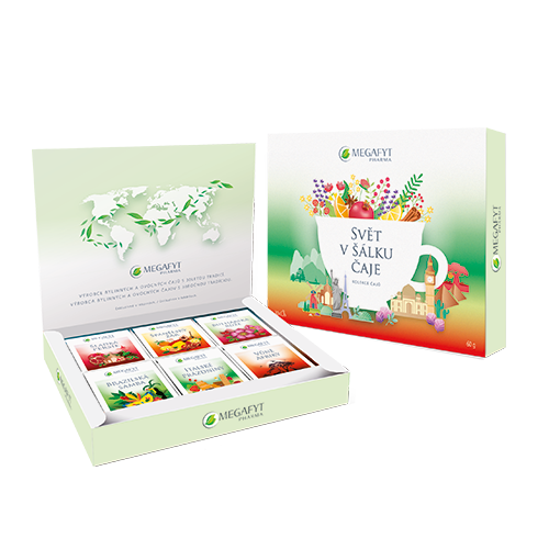 6 druhů čajových směsí – ovocných, bylinných a čaje pravého s různými příchutěmi.